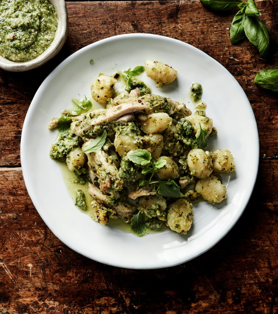 - Kuumenna tilkka öljyä paistinpannulla ja pyöräytä gnocchit öljyssä. Lisää broileri ja pyöräytä sekaisin. Kääntele haluamasi verran pestoa joukkoon. Tarkista maku ja lisää pestoa halutessasi. Tarjoa heti.