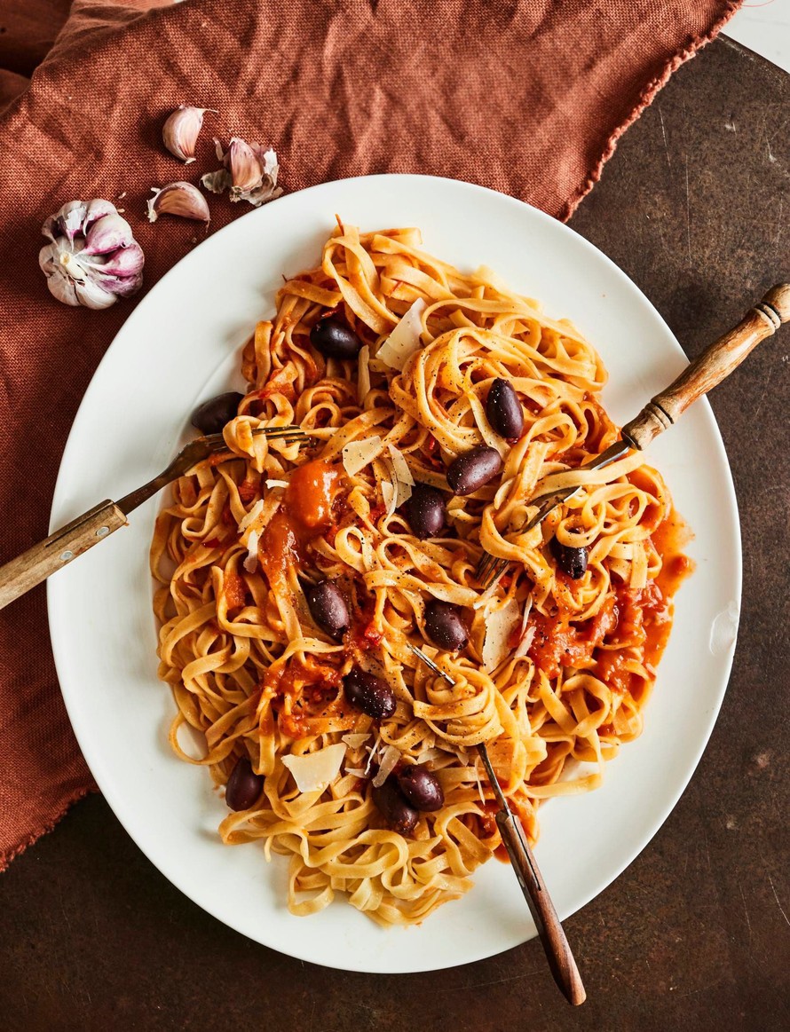 Pehmeänmakuinen tomaattikastike maistuu kaikille. Nakkaa sekaan oliiveja ja parmesaania, niin pasta-annos on valmis.