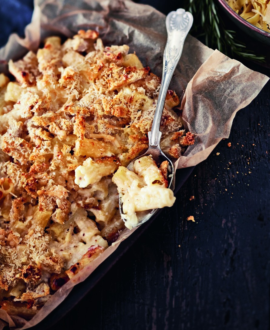 Amerikkalaisen lohturuokaklassikon hienostuneempi versio maustetaan kokojyväsinapilla. Vuokaan sulatetaan perusjuuston sijaan cheddaria ja parmesaania.