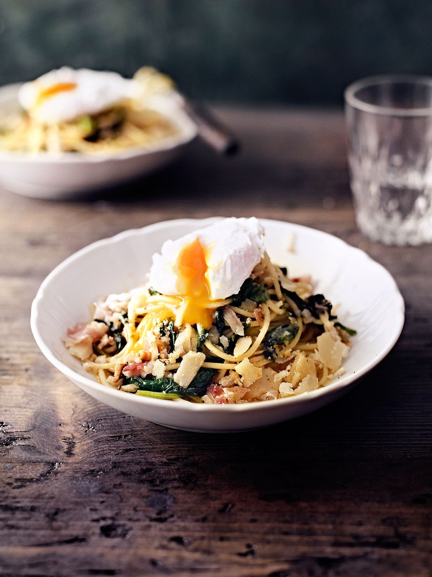 Tämän pastan kastikkeena toimii uppomunan valuva keltuainen.