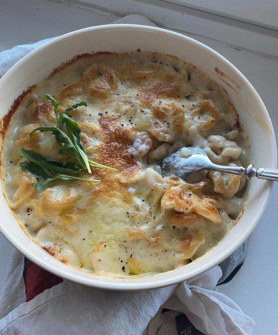 Resepti on peräisin huippukokki Hans Välimäen ja käsikirjoittaja Santtu Palmin podcastista Eiku se on just näin, joka yhdistää hyvän ruuan ja kärkevät mielipiteet. Sarjan viimeisessä jaksossa Hans antaa ohjeen mac & cheese -vuokaan. Voit kuunnella jakson Suplasta.