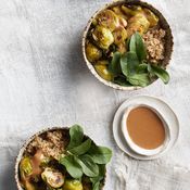- Paista tällä välin porkkanat. Kuumenna voi ja öljy paistinpannulla. Lisää valkosipulinkynnet ja porkkanalastut. Paista viitisen minuuttia. Lisää joukkoon mantelit ja huuhdotut pinaatinlehdet.
