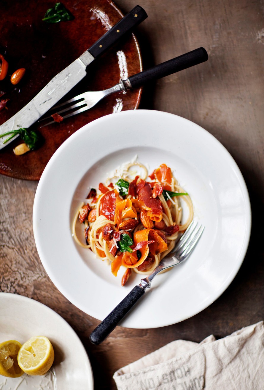 Helppo pasta valmistetaan porkkanasta ja pinaatista. Rapeaksi paahdettu kinkku viimeistelee annoksen.