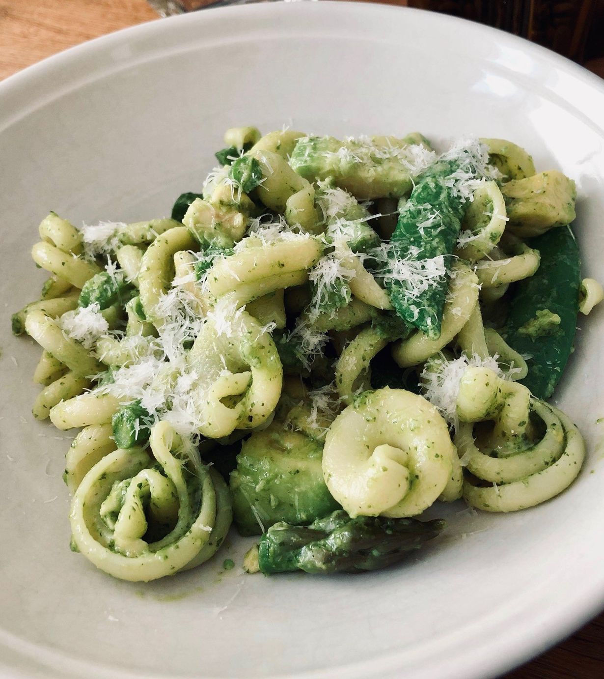 Lisää n. 1 1/2 dl pastan keitinvettä paistokasariin ja laita liesi miedolle lämmölle. Sekoita parmesaani joukkoon ja anna seoksen lämmetä pari minuuttia. Sekoita vesi-parmesaaniin al denteksi keitetty pasta. Lisää mauste-öljykastike ja sekoita hyvin. Pilko parsa sopiviksi suupaloiksi ja lisää ne pastan joukkoon. Lisää sokeriherneet kokonaisina ja vielä lopuksi avokadolohkot.