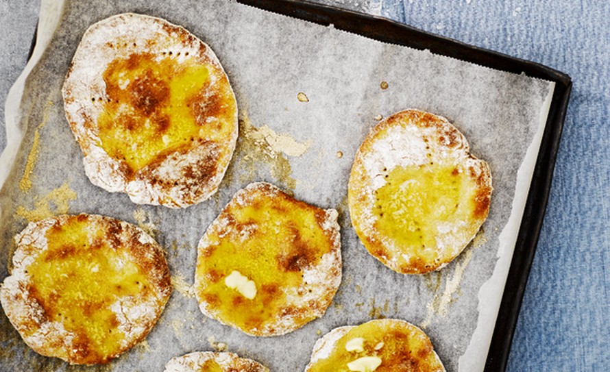 - Vuoraa uunipelti leivinpaperilla. Taputtele taikinasta jauhotetuilla käsillä halkaisijaltaan 10 cm:n kokoisia leipäsiä pellille. Pistele leivät haarukalla.