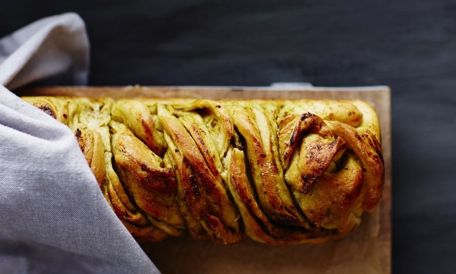 - Voitele leipävuoka. Kauli kohonnut taikina jauhotetulla alustalla suorakaiteen muotoiseksi, ohueksi levyksi. Levitä pesto nuolijan avulla koko levylle. Kääri levy pitkältä sivulta rullaksi korvapuustin tapaan. Leikkaa rulla pituussuunnassa kahtia. Letitä pötköt löysästi ja nosta leipävuokaan. Paista 175 asteessa 30 minuuttia.