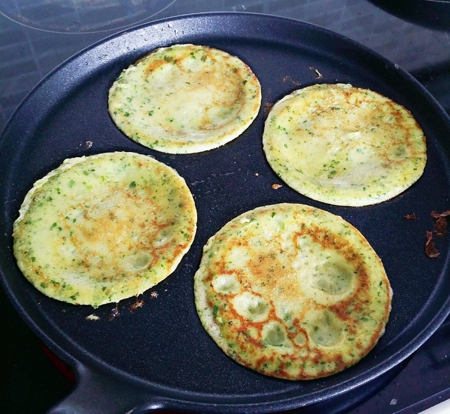 Sekoita kulhossa munat, maito, jauhot, suola ja voisula. Sulata pinaatti vaikka mikrossa ja lisää taikinaan. Anna taikinan turvota 30 minuuttia huoneenlämmössä, tai laita suoraan pannulle jos on kiire. Paista letut runsaassa voissa.