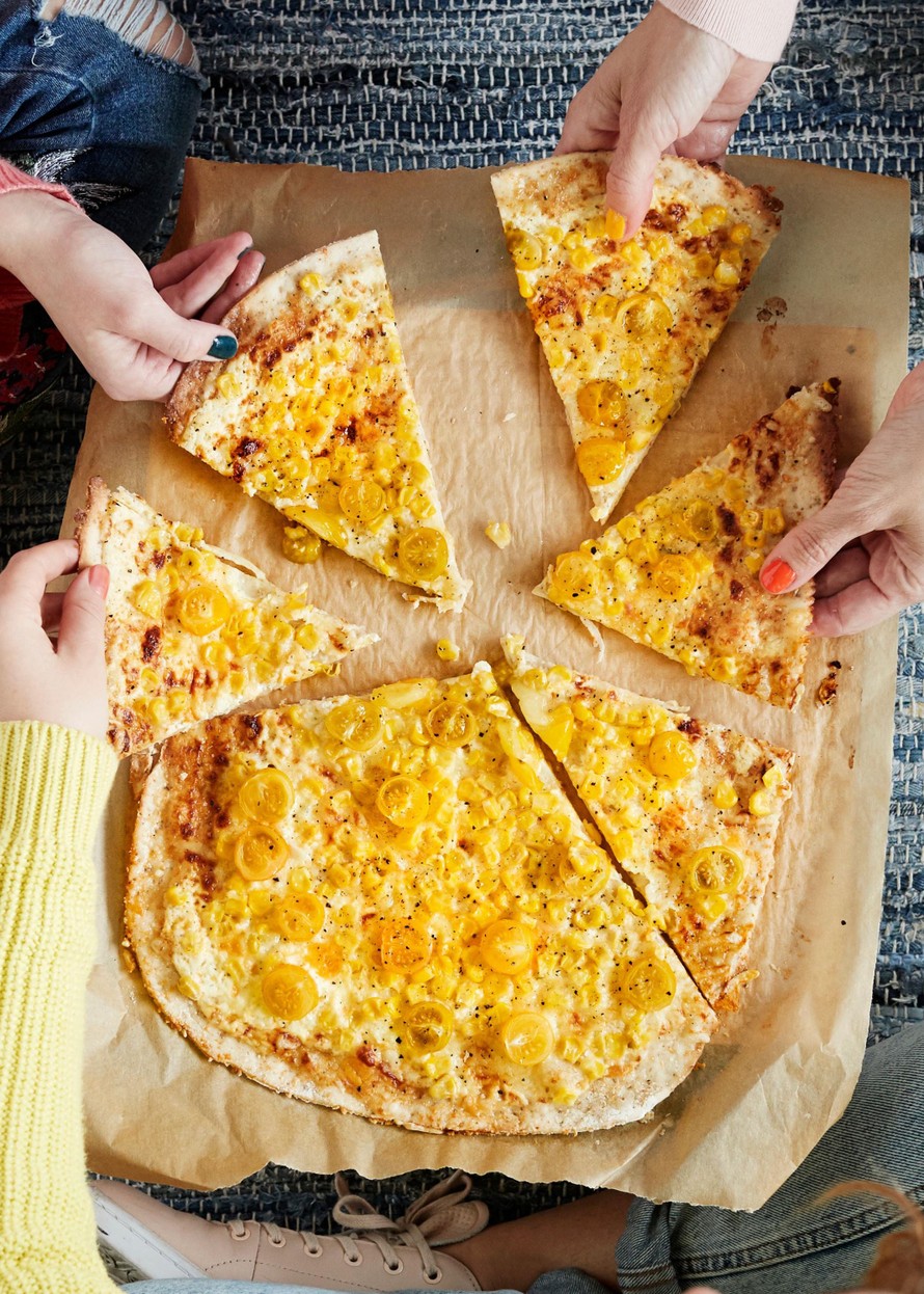 Maissi ei ole tyypillisin pizzan täyte, mutta makeiden tomaattien ja valkosipulisen ranskankerman kanssa siitä tulee uusi suosikkisi.