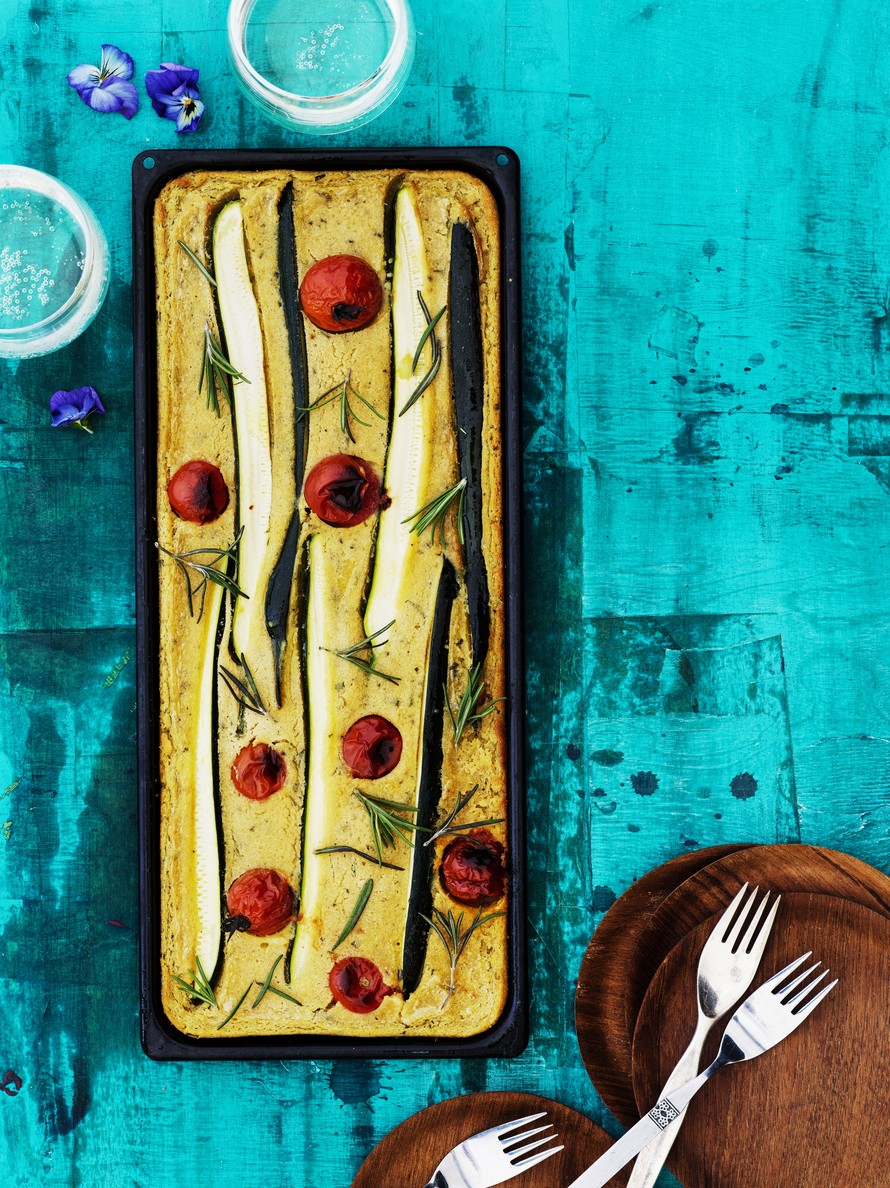 - Asettele kesäkurpitsanviipaleet ja tomaatit farinatan pinnalle. Paista uunissa 20-25 minuuttia, kunnes farinata näyttää kypsältä pannukakulta ja kasvikset ovat saaneet hieman väriä.