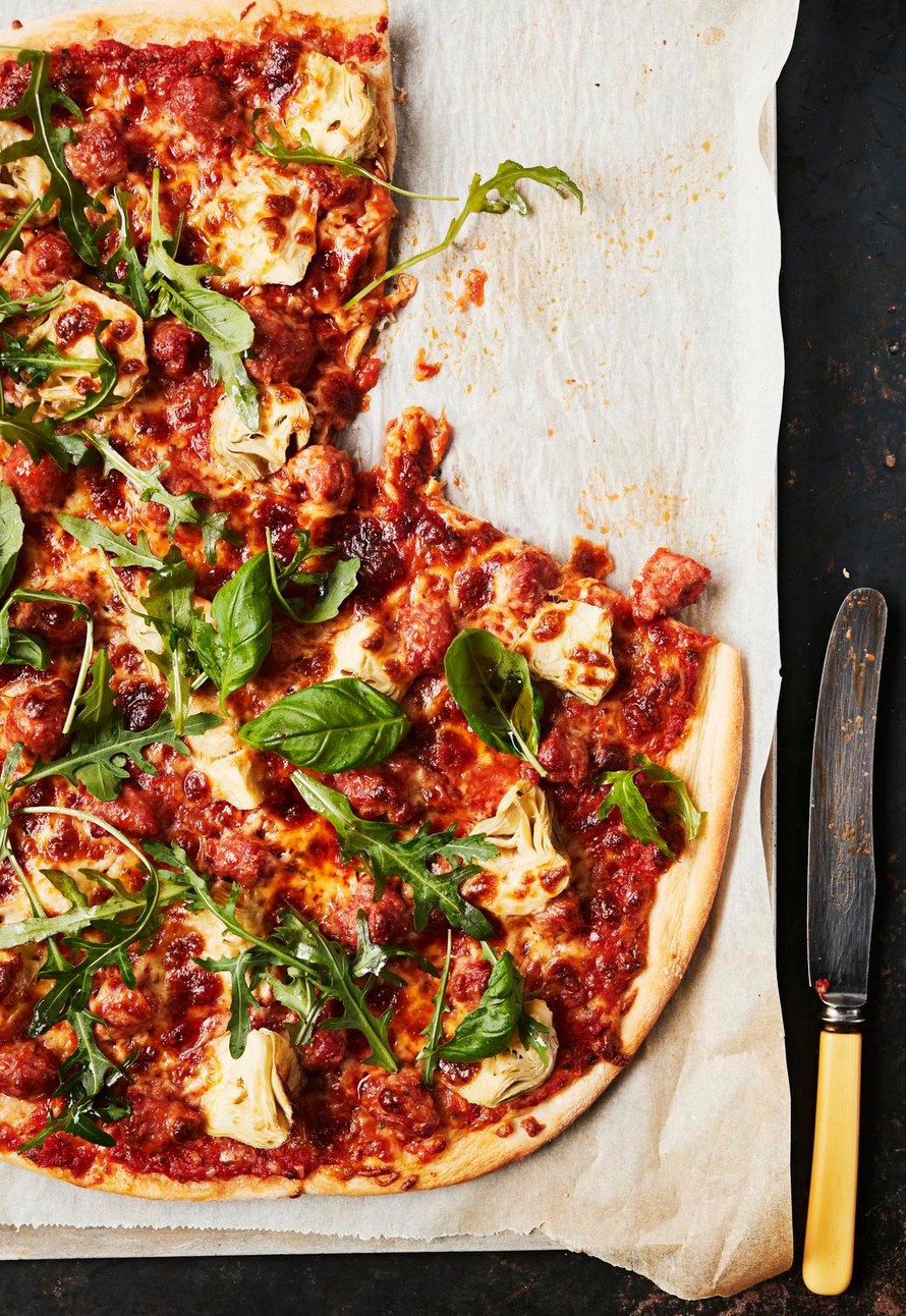 Nakkipitsan trendiserkkuun pyöräytetään täytteeksi tuoremakkaraa ja artisokkaa.