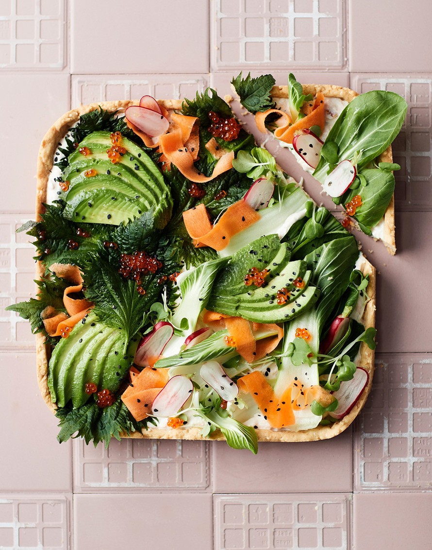 - Levitä lohitäyte piirakkapohjalle juuri ennen tarjoamista. Valuta pikkelöidyt kasvikset siivilässä. Halkaise avokado, poista kivi ja kuori, viipaloi hedelmäliha. Kokoa piirakan päälle paksoin ja shison lehtiä, avokadoviipaleita, pikkelöityjä kasviksia, mätiä ja seesaminsiemeniä. Tarjoa heti.