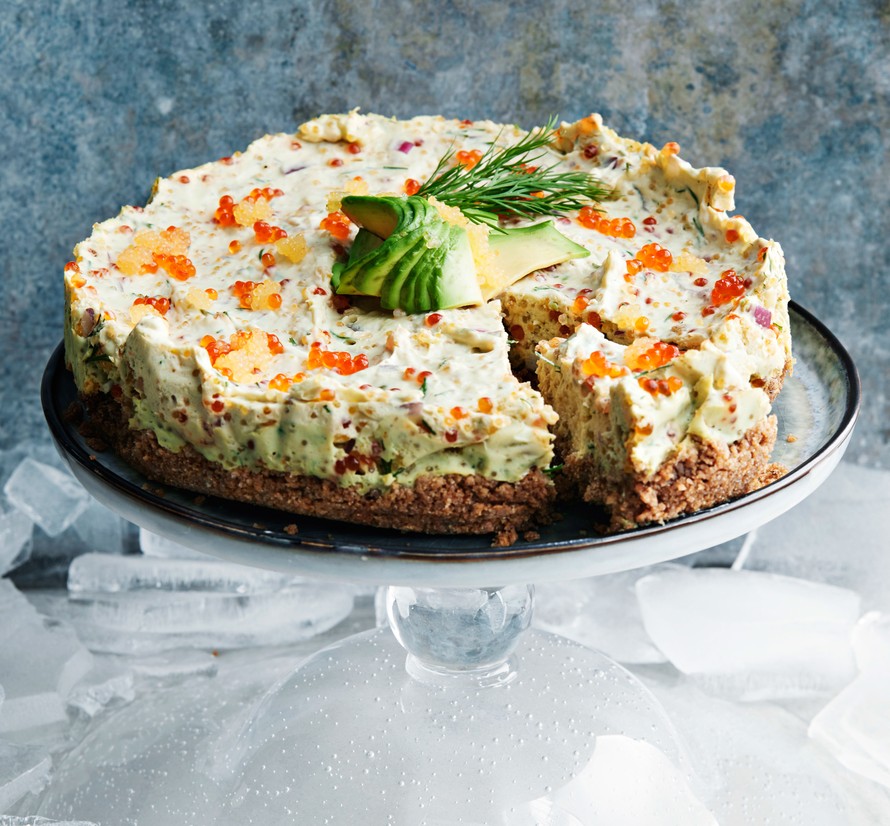Voileipäkakku päivittyi juuri tälle vuosikymmenelle! Tarjoile avokadolla pehmitetty kahden mädin kakku kuohuviinin kera.