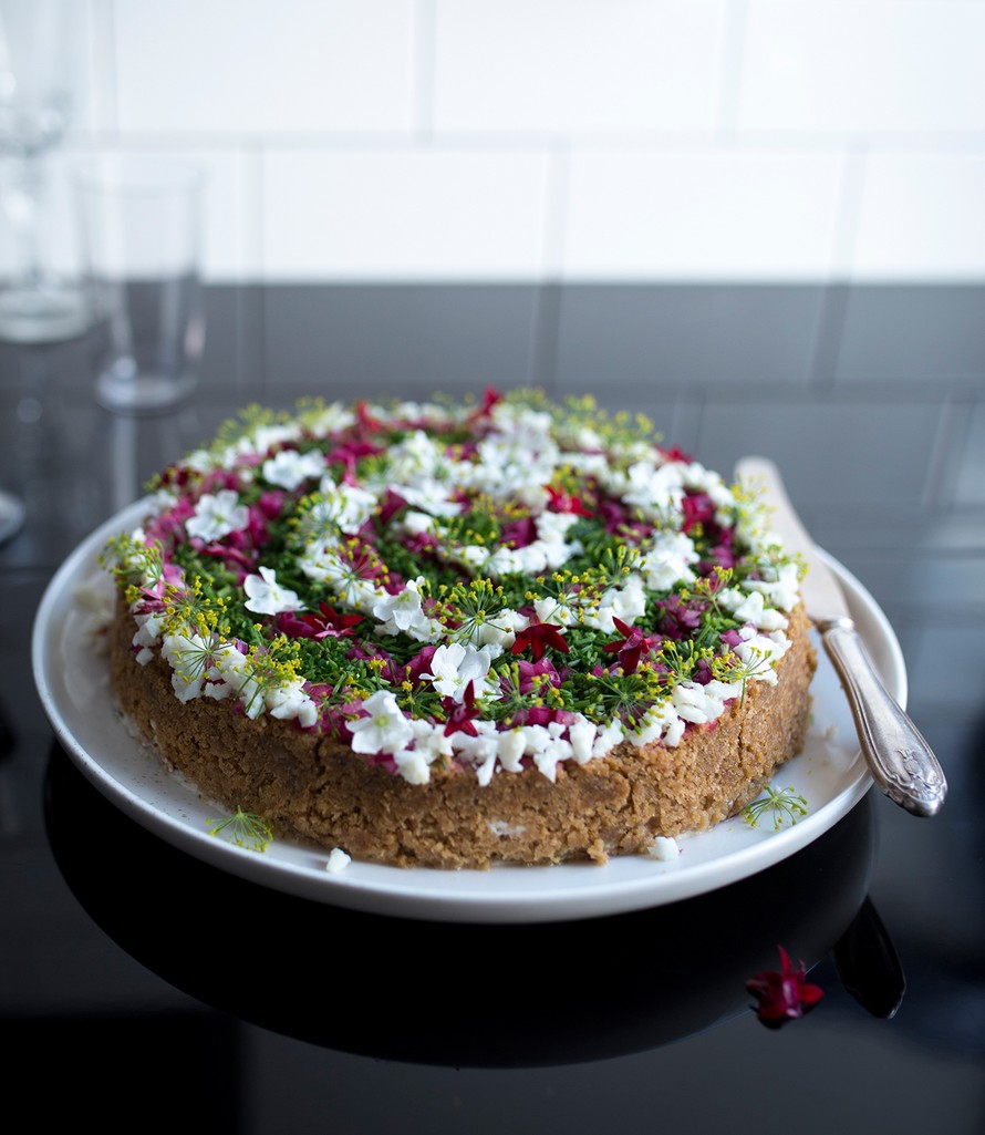 - Hienonna ruohosipuli ja kuorittu punasipuli. Koristele kakku hienonnetulla kananmunalla, ruohosipulilla ja punasipulilla. Viimeistele ruohosipulinkukilla tai muilla syötävillä kukilla ja nosta tarjolle.