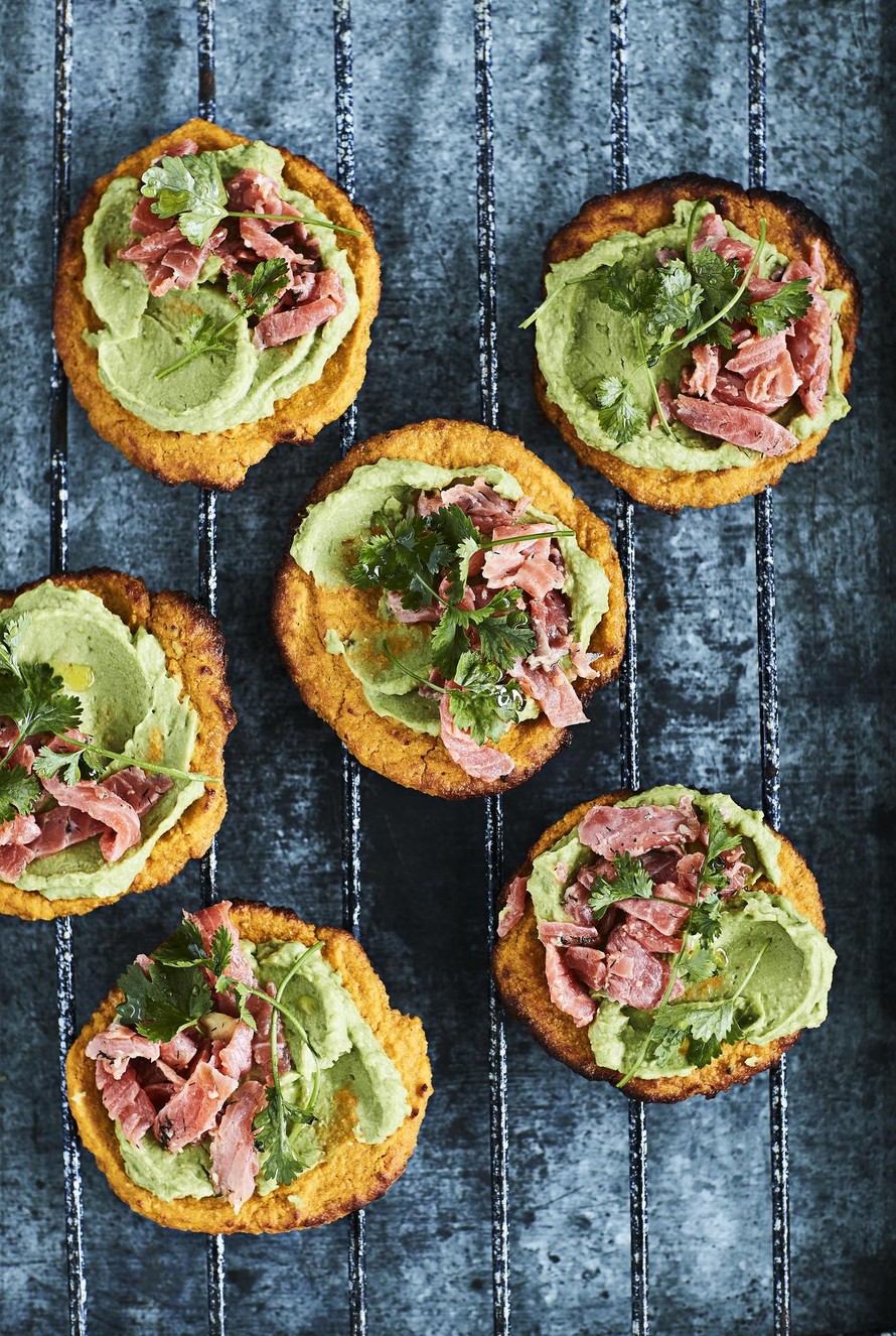 Minipizzojen pohja syntyy bataatista ja kaurajauhoista. Tomaattikastikkeen korvaa maukas avokadohummus, ja täytteeksi ripotellaan graavilohta. Varoitus: koukuttavien hyvien pikkuherkkujen syömistä on vaikea lopettaa.