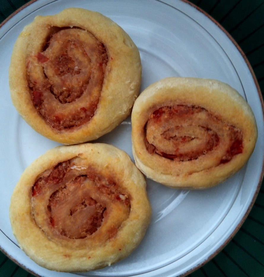 3. Lisää täytteeksi paloiksi murrennetut kasvispihvit öljyn kera. (Täytteen voi vaihtaa toisenlaiseksi oman maun mukaisesti, esimerkiksi voi käyttää muita keinolihatuotteita tai tunnettuja pizzatäytteitä.)