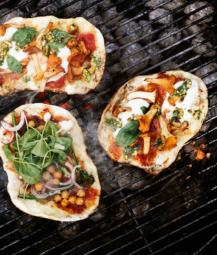 Kantarellit, mozzarella ja pistaasipesto – muutama tarkoin harkittu aines riittää täydelliseen grillipizzaan.