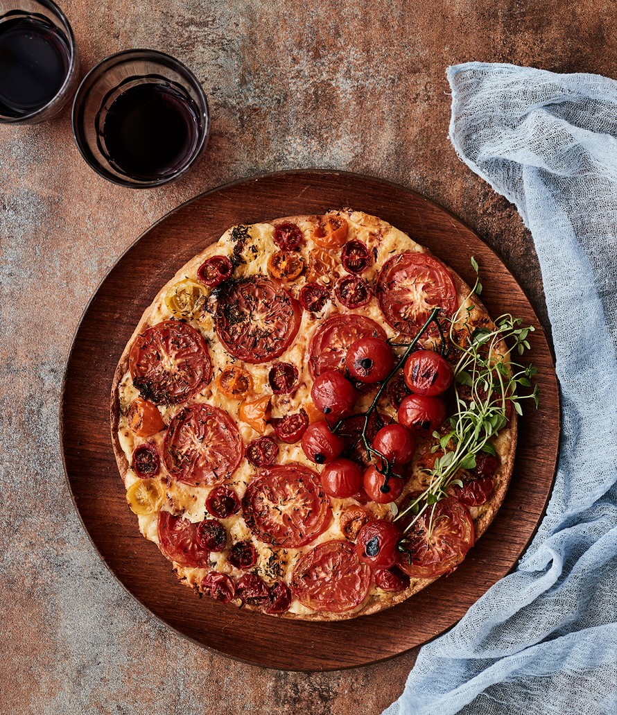 Täytteeksi ei tarvitse sekoitella kermaa ja kananmunia, sillä pelkkä juustokerros riittää mehevöittämään piirakan. Tomaattien raikkaus antaa täyteläisyyteen hyvää vastapainoa. Käyttämällä erikokoisia tomaatteja pinnasta saa hauskannäköisen.