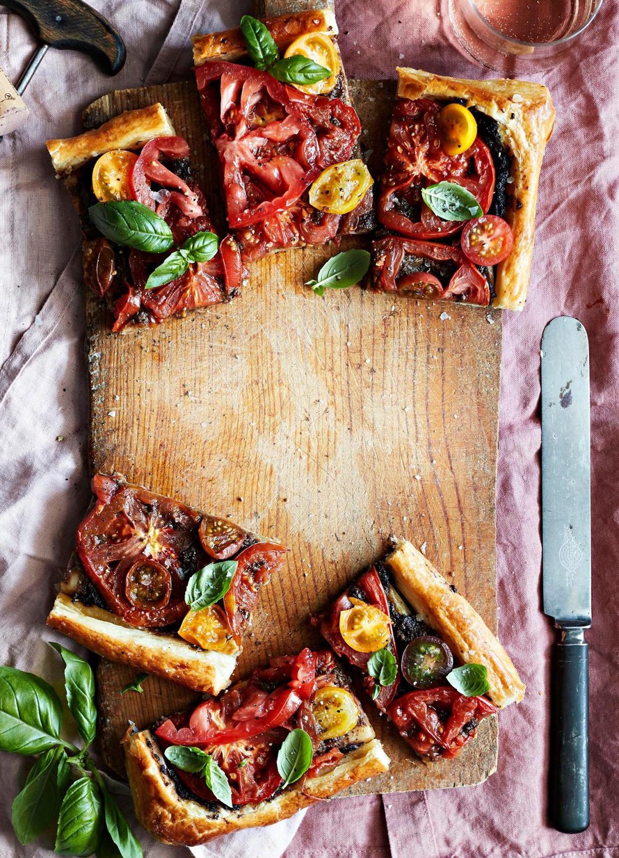 Auringon alla kypsyneet tomaatit saavat suolaisen potkun tapenadesta. Mehevä täyte toimii ihanasti lehtevän ja rapean pohjan kanssa.