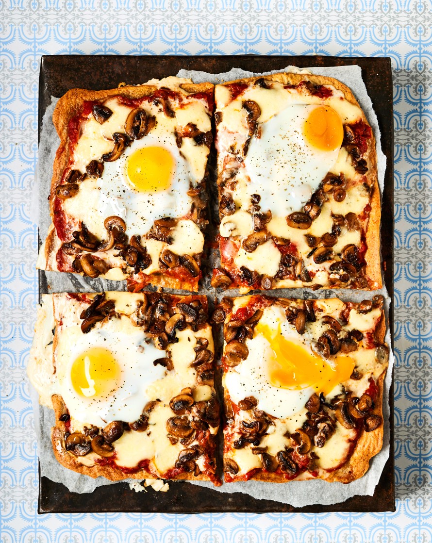 - Levitä tomaattikastike pizzalle ja revi mozzarella paloiksi. Levitä mozzarella ja paistetut herkkusienet pizzalle. Riko kananmunat pizzan päälle, lähelle jokaista kulmaa. Paista pizzaa vielä 10–12 minuuttia, kunnes kananmunien valkuainen on hyytynyt ja juusto on sulanut. Rouhi pizzan päälle mustapippuria myllystä ja tarjoa se neljäksi annospalaksi leikattuna.