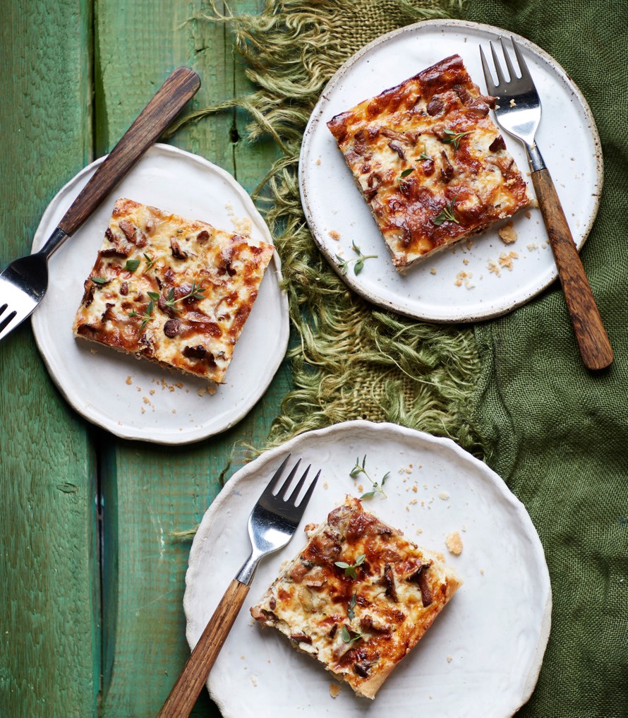 Mehevä kantarellipiirakka vie nälän isommaltakin porukalta. Pohja saa mureutta perunahiutaleista ja täytteen kruunaa gruyèren ja mustaleimaemmentalin yhdistelmä.