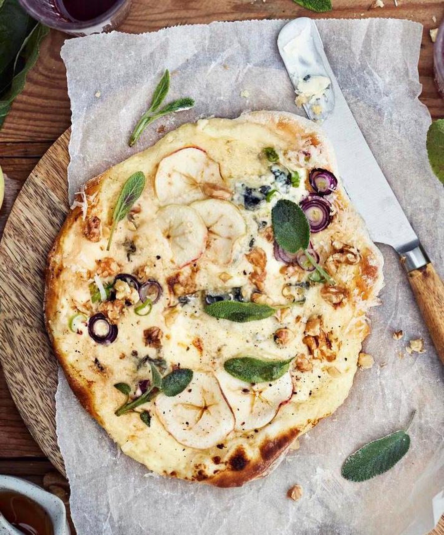 Omenat sopivat myös pizzaan! Tutut makuparit, kuten sinihomejuusto, saksanpähkinä ja vaahterasiirappi saavat veden kielelle jo ennen kuin pizza koskettaa kuumaa peltiä.