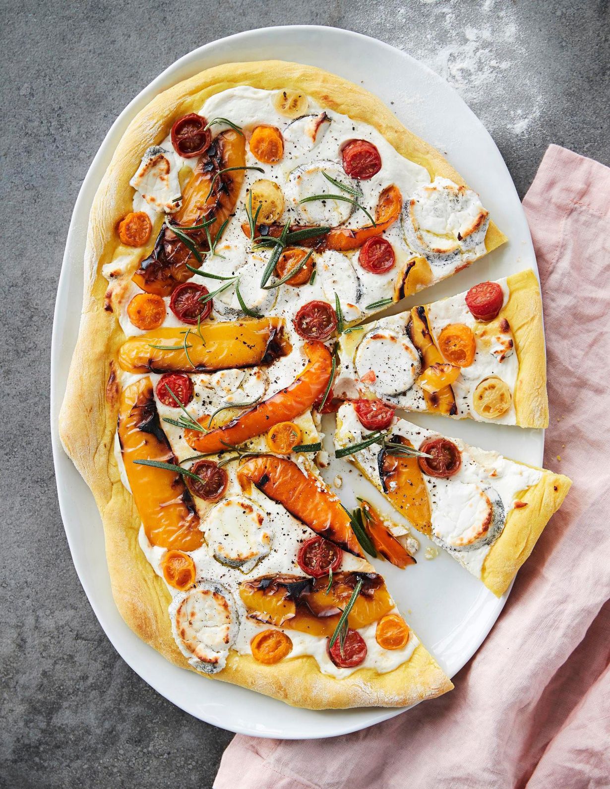 - Levitä pitsapohjan päälle jugurtti. Levitä pinnalle paahdetut paprikat, tomaatit ja vuohenjuustosiivut. Riivi päälle rosmariinin lehtiä.
