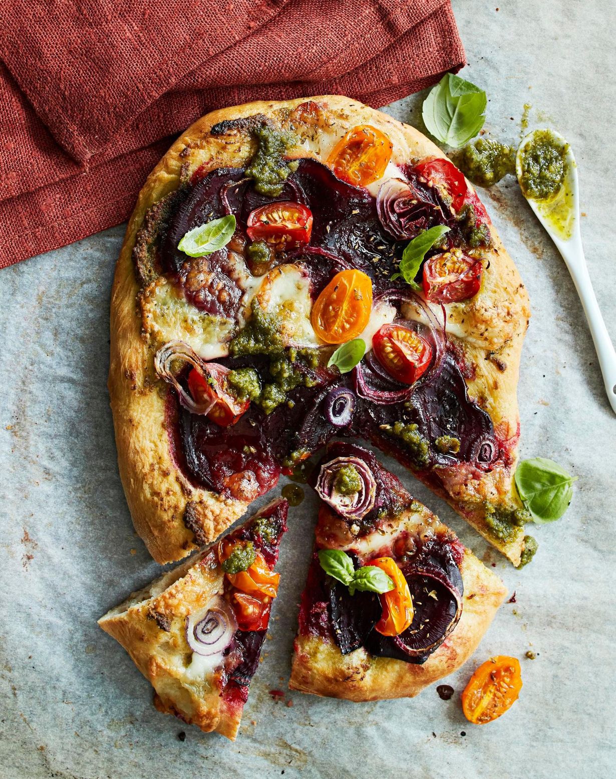 Yön yli kohonnut taikina on rapeakuorisen pizzan salaisuus. Ohuet punajuurisiivut maistuvat peston ja mozzarellan kera ihanilta pizzan päällä.
