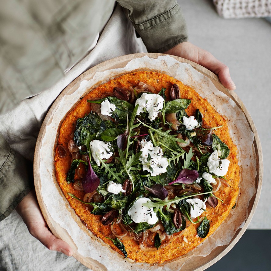 Vaihda vehnäjauhot bataattiin! Kolmen raaka-aineen bataattipohja toimii mahtavan hyvin sipulitäytteen kanssa. Viimeistele pizza pehmeällä vuohenjuustolla ja pinaatilla.