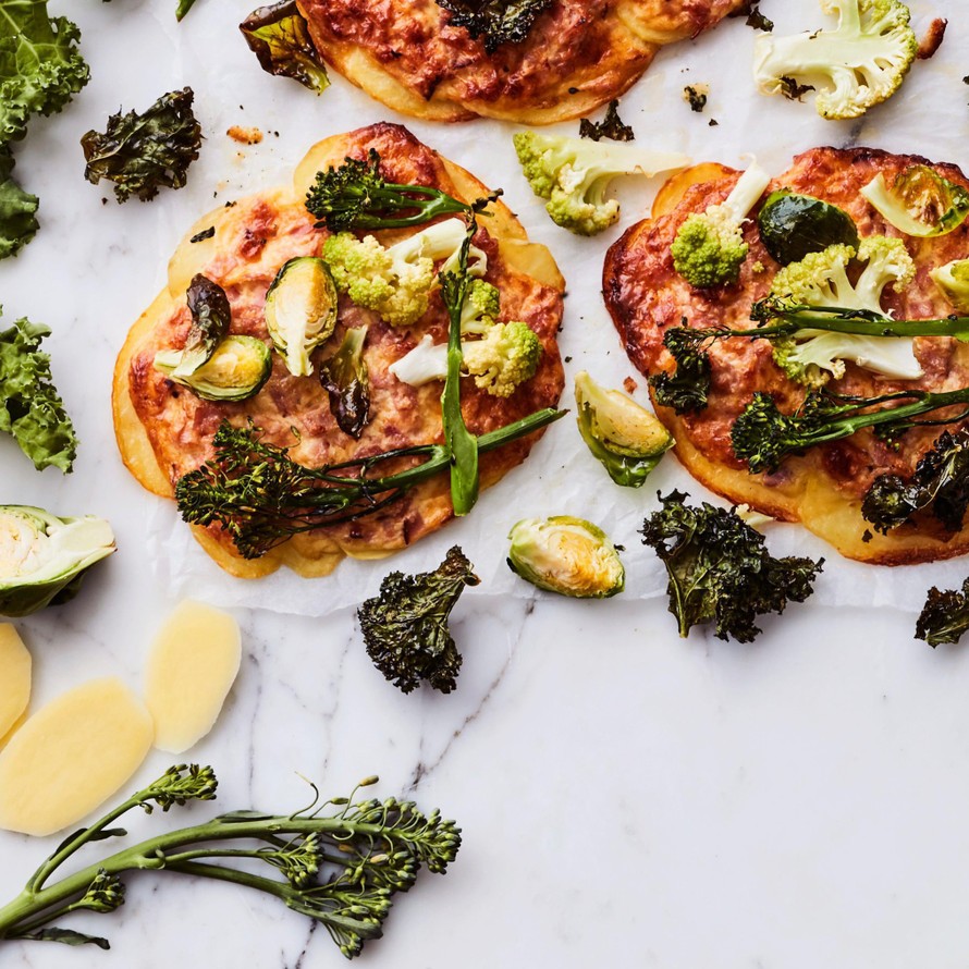 Laita uuni kuumenemaan 200 asteeseen. Kuori perunat ja viipaloi ne mahdollisimman ohuiksi. Älä huuhtele viipaleita, sillä tärkkelys pitää pohjan koossa. Lado viipaleet uunipellille limittäin neljäksi piiraspohjaksi (Ø noin 10–15 cm). Sulata voi ja voitele sillä perunapohjat. Esikypsennä uunissa 10 minuuttia ja valmistele sillä aikaa kinkkutäyte ja kaalit.