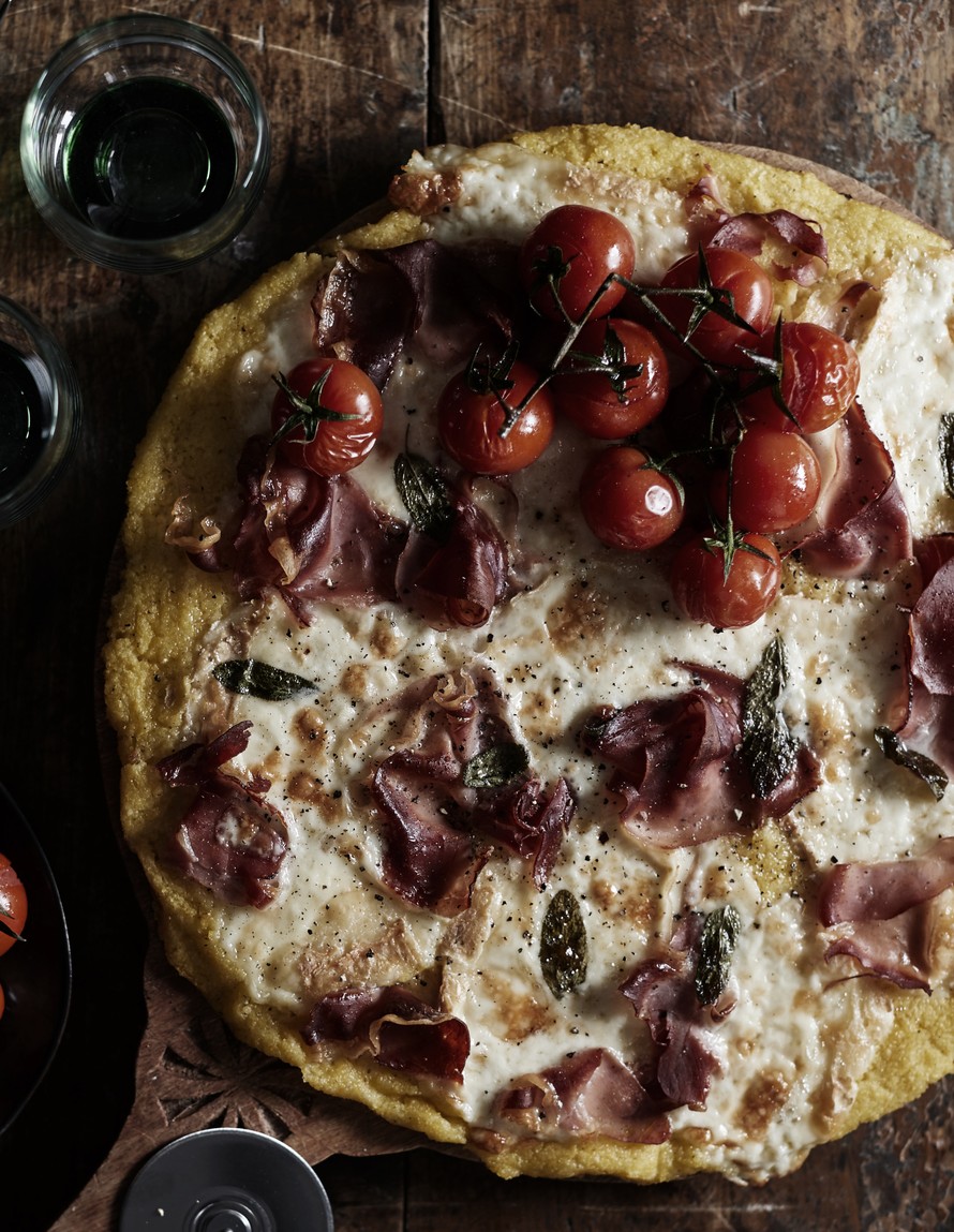 Polentasta voi tehdä gluteenittoman pizzapohjan kymmenessä minuutissa. Pizzapohja saa makua parmesaanista. Polentapohjan päälle ei laiteta tomaattikastiketta, vaan sille viipaloidaan italialaista taleggio-juustoa. Taleggio on runsasrasvainen juusto joka sulaa ja ruskettuu kauniisti pizzan päälle. Sen kanssa maistuu parmankinkku ja kokonaiset kirsikkatomaatit.