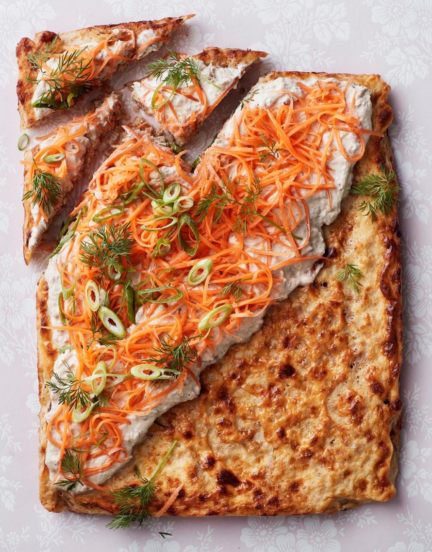 - Lusikoi särkitäyte rieskalle. Valuta porkkanasuikaleista liemi pois ja lisää porkkanat särkitäytteen päälle. Hienonna kevätsipuli ja ripottele se rieskalle. Koristele tillillä.