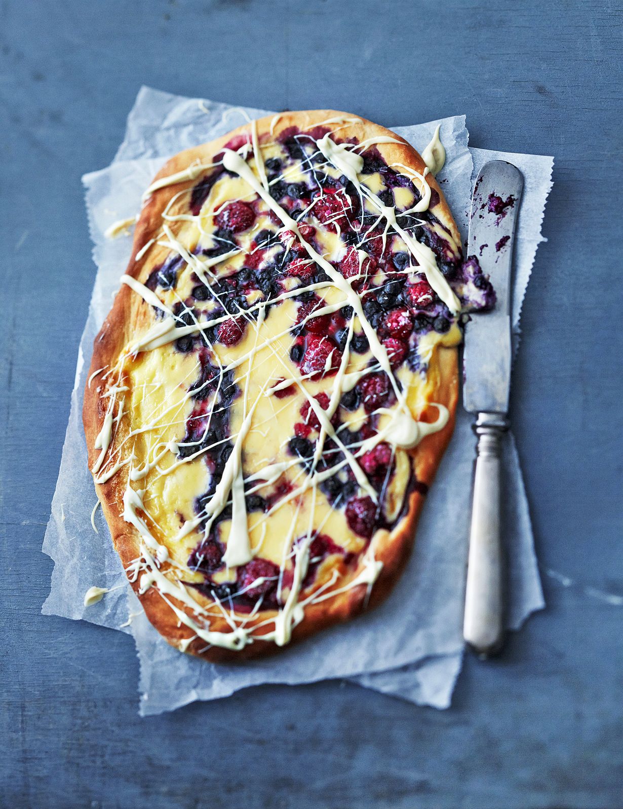 Marjapizzassa risteytetään kaksi ihanaa eli pizzamaisen ohut, makea pullapohja ja mascarpone-marjatäyte. Taiteile päälle vielä picassomaisen rennosti viivoja valkosuklaasta.