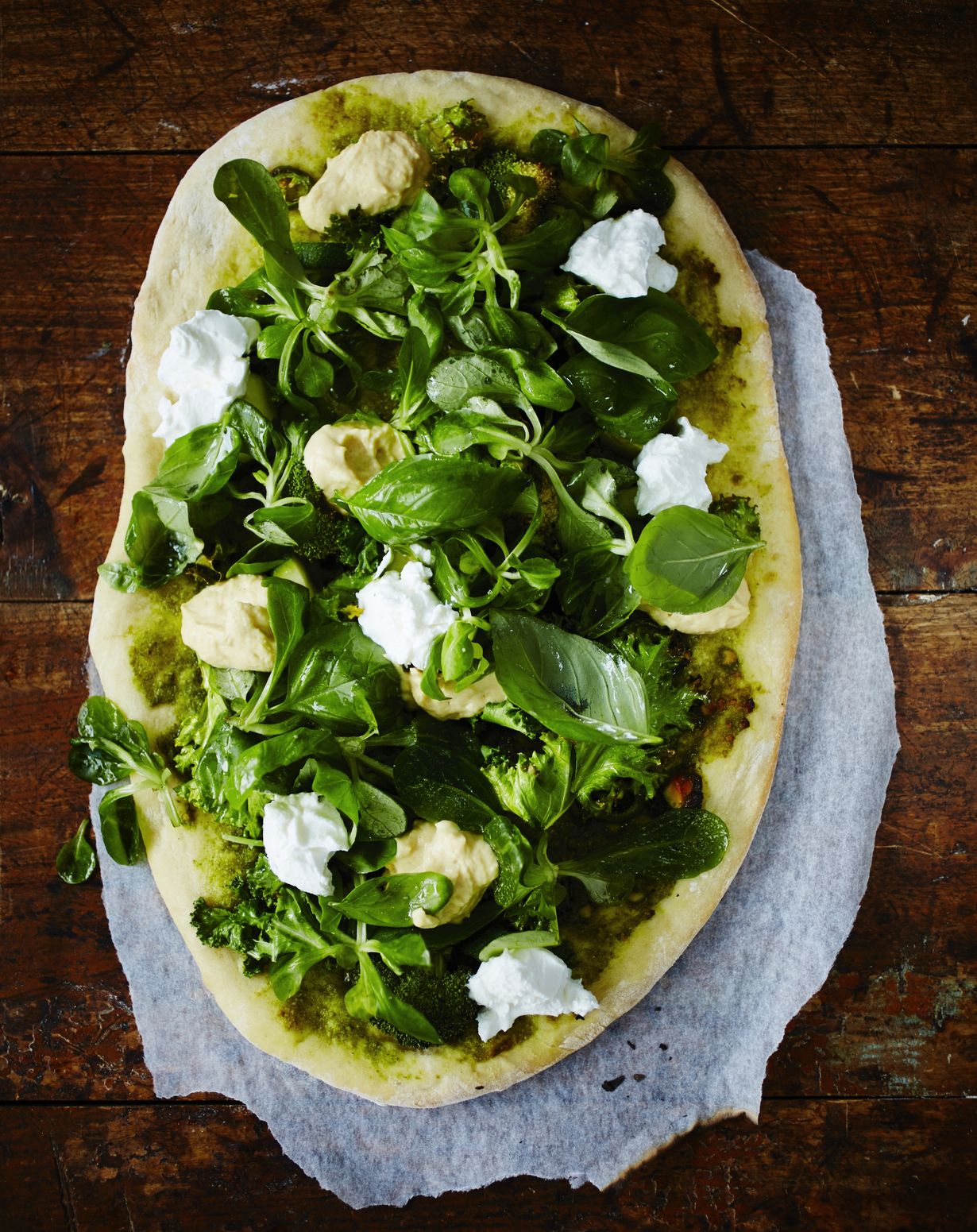 5. Levitä kypsän pizzan päälle salaattia ja basilikan lehtiä. Nostele lusikalla juustonokareita ja hummuskasoja päälle. Valmista toinen pizza samalla tavalla.