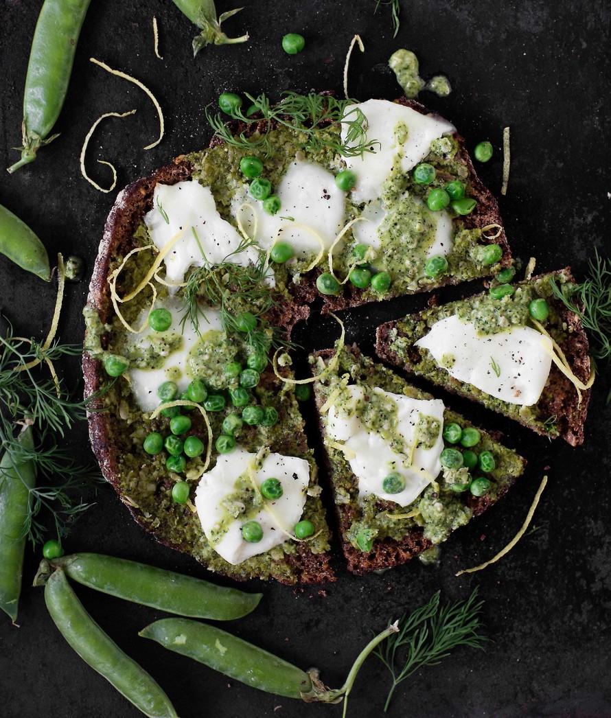 - Ohenna jäljelle jäänyttä pestoa halutessasi hieman sitruunamehulla tai öljyllä. Valuta se juustojen päälle ja leikkaa leipä paloiksi. Ripottele päälle reilusti herneitä, tilliä ja sitruunankuoriraastetta.