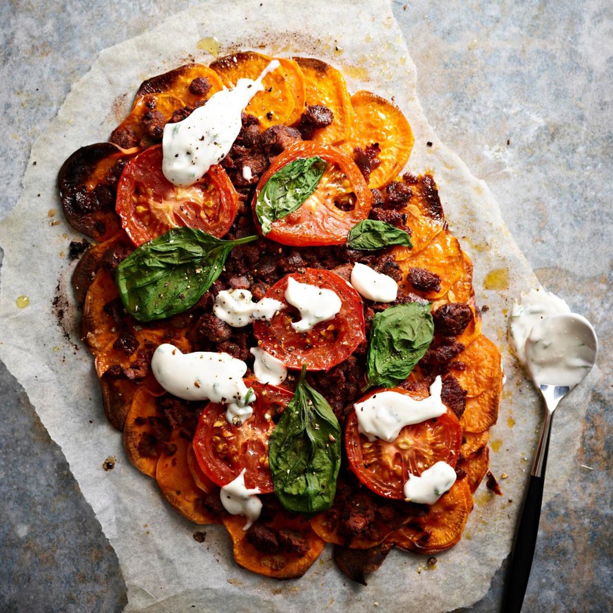 Bataatista syntyy supermaukas pizzapohja! Laita täytteeksi härkistä ja tomaattia, ja kun pizza on tullut uunista, viimeistele se tuoreella basilikalla ja vegaanisella ranskankermalla.