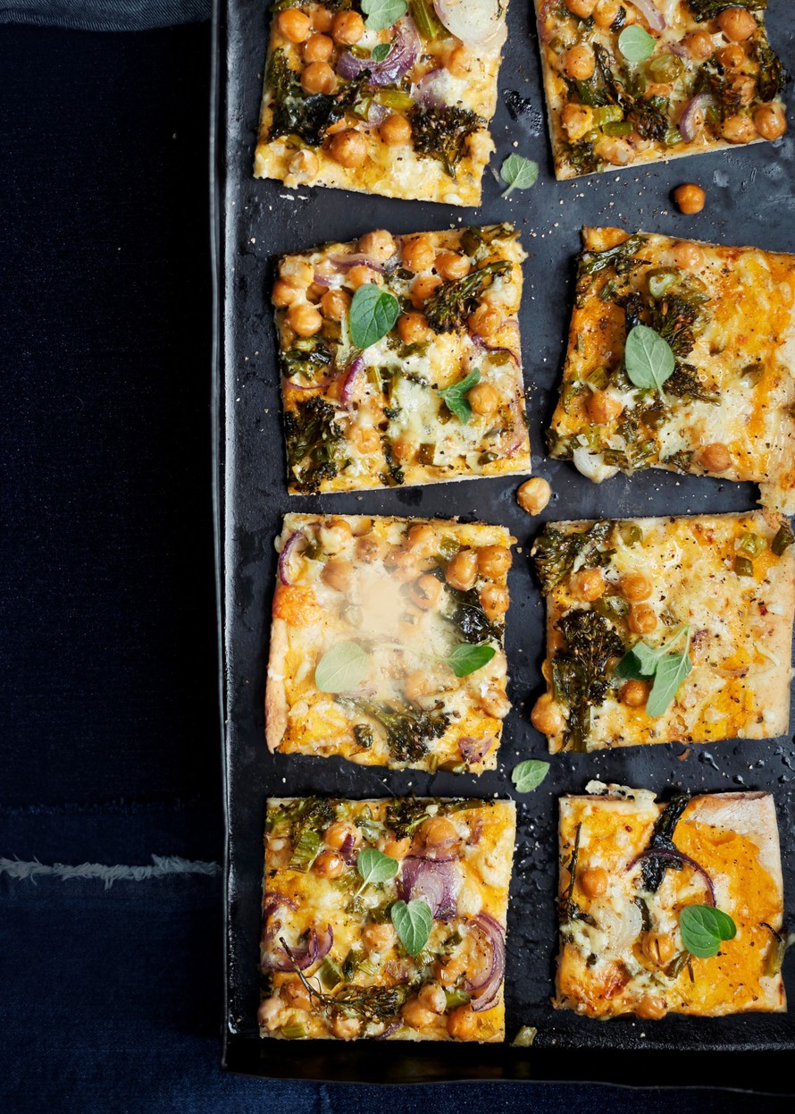 Vegaanisen kasvispizzan kastike ei ole valkoinen eikä punainen, vaan keltainen! Makea kurpitsa sopii ihanasti peltipizzan mehevöittäjäksi.