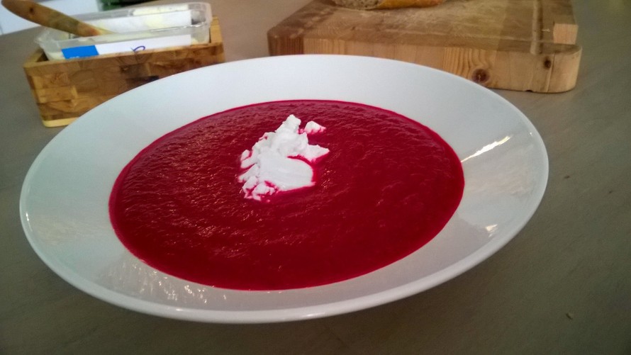 Laita kanaliemi kiehumaan. Pilko kaikki ainekset ja lisää kiehuvaan veteen. Keitä kunnes punajuuret kypsiä. Soseuta keitto ja lisää soseeseen kerma. Mausta siirapilla, suolalla ja pippurilla.