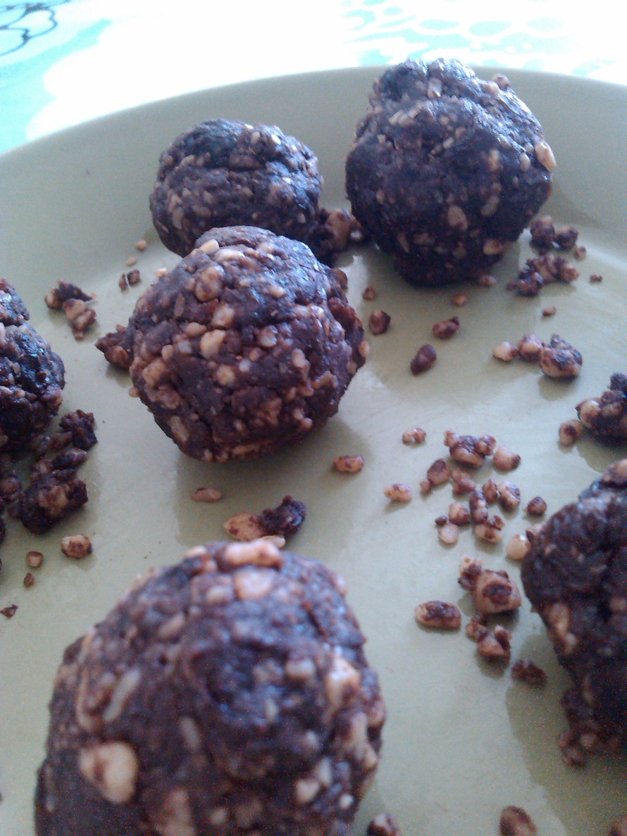 Lisää taatelit ja jatka hienontamista. Muovaa seoksesta palloja, tai painele seos vuokaan ja leikkaa pienemmiksi paloiksi. Laita jääkaappiin ja malta odottaa 30min, ja nauti. Pallerot säilyvät jääkaapissa hyvinä viikon, voidaan myös pakastaa.