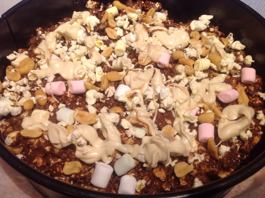 - Sulata valkosuklaa mikrossa ja levitä sitä raidoiksi rockyroadin pinnalle. Koristele pinta vielä popcorneilla, vaahtokarkeilla ja suolapähkinöillä. Anna jähmettyä jääkaapissa noin tunti ja leikkaa pizzapalojen tapaan.