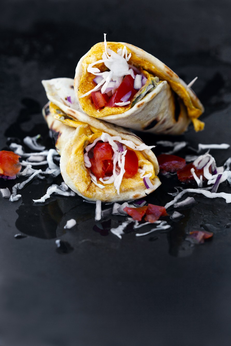 - Nosta valmis chapati-munakas lautaselle munakaspuoli ylöspäin ja levitä kaali tasaisesti viivaksi munakkaan päälle, parin sentin päähän toisesta reunasta. Lisää päälle tomaarrisiivut, mausta suolalla ja kääri rullaksi.