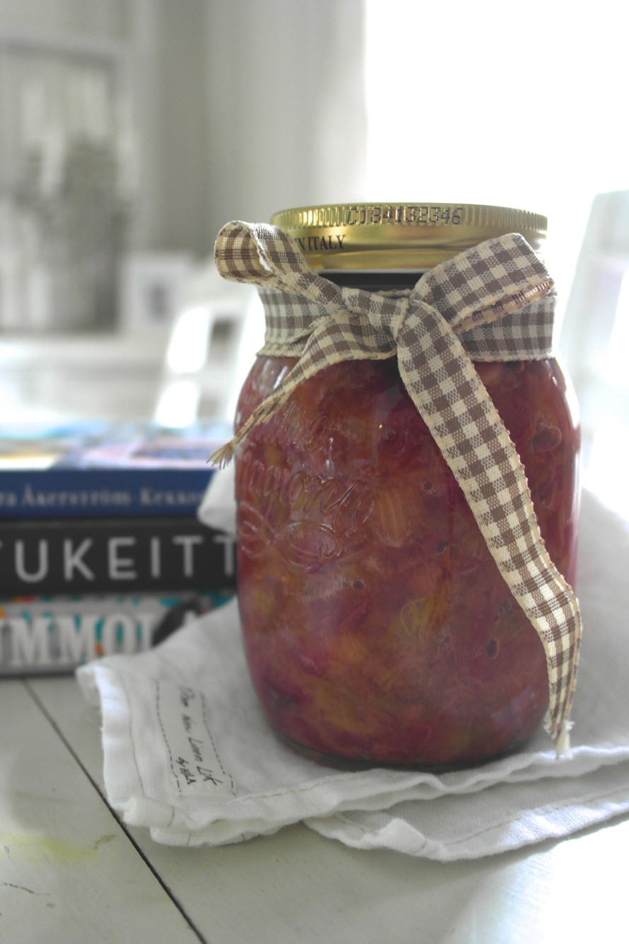 Paloittele raparperit, sipuli, siemenetön chili. Laita kaikki aineet kattilaan ja keittele hiljalleen 15-20 minuuttia. Nouki kanelitanko pois ja purkita. Säilytä jääkaapissa ja nauti grillilihan, kanan ja muiden suolaisten kesäherkkujen kanssa!
