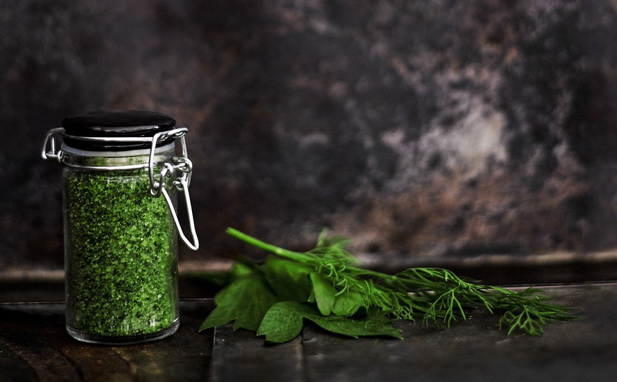 - Murskaa merisuola, sitruunankuori ja yrtit sauvasekoittimella hienoksi rouheeksi. Lisää joukkoon halutessasi kehäkukan terälehdet.