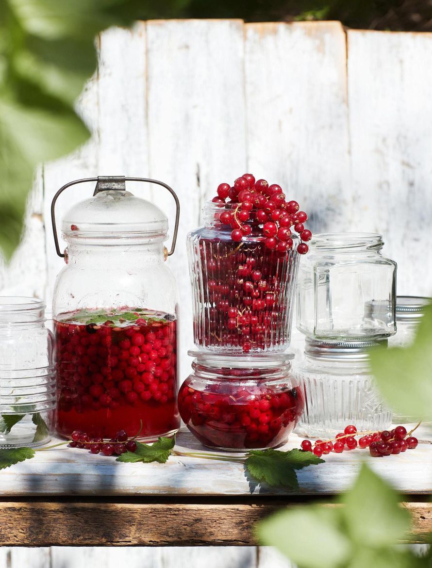 Riivi ja huuhtele marjat. Huuhtele herukanlehdet. Laita marjat ja lehdet kerroksittain litran vetoiseen tai kahteen pienempään, puhtaaseen lasipurkkiin.