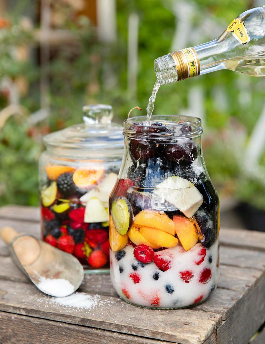 - Lado hedelmät ja marjat kerroksittain sokerin kanssa puhdistettuun isoon ruukkuun tai kannelliseen lasitölkkiin. Suhteuta ainesten määrä niin, että kiloon hedelmiä tulee puoli kiloa sokeria.