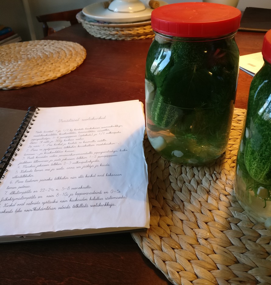 Ohje on peräisin vanhempieni tuttavapariskunnalta 90-luvun alusta. Meillä kotona kurkkuja on tehty tämän ohjeen mukaan siis vuosikymmeniä, ja repaleista ohjetta vaalittu kuin kallisarvoista aarretta.