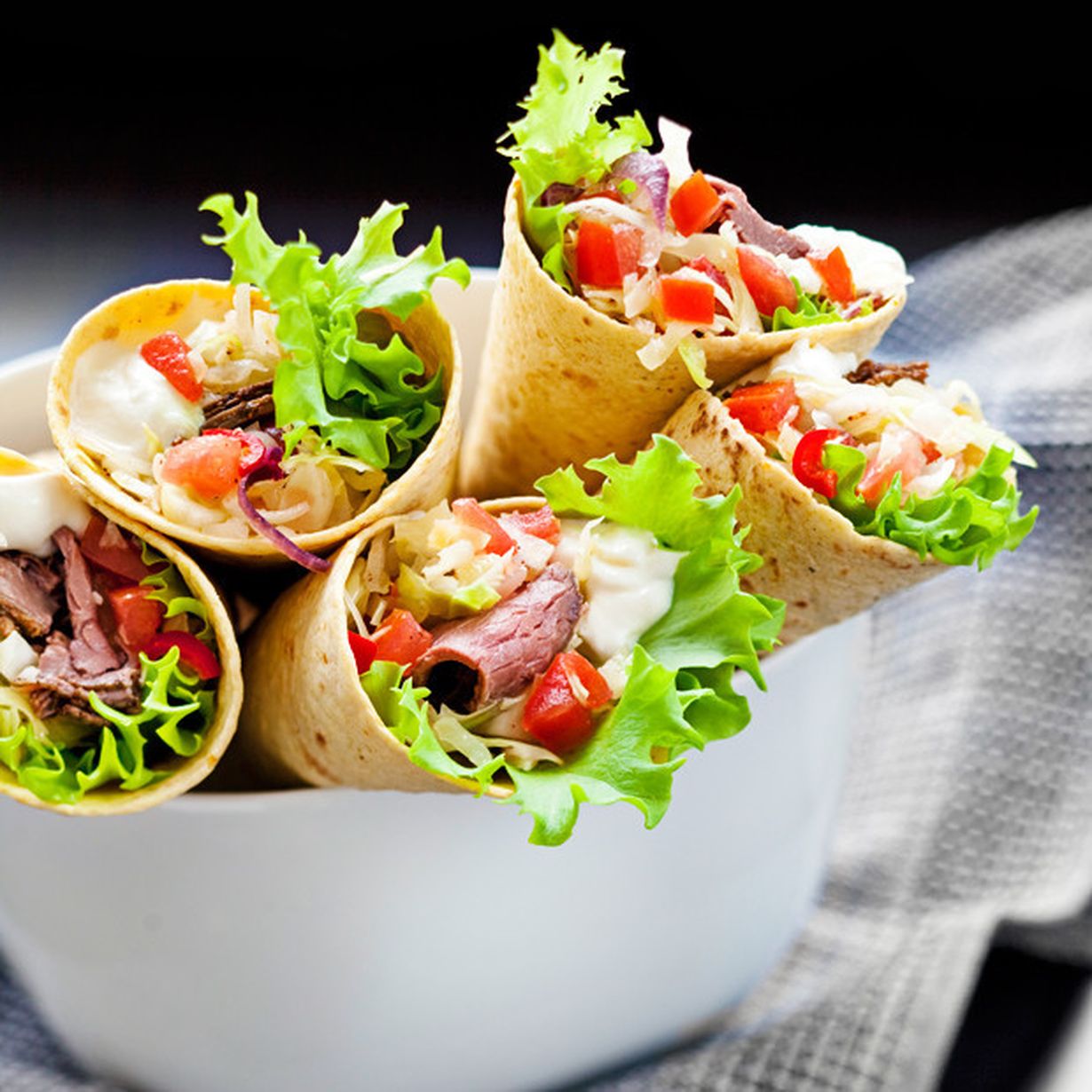 - Lämmitä tortillat uunissa tai mikrossa juuri ennen tarjoilua. Aseta jokaiselle salaatinlehti, kaalisalaattia, paistisuikaleita, ranskankermaa ja tarjoa.