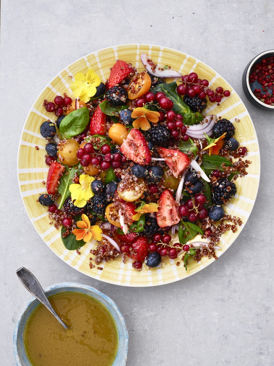 Panosta salaatissa kvinoan käsittelyyn, sillä loppu syntyy kuin itsekseen! Salaatti pursuaa ihania tuoreita marjoja, joten se sopii täydellisesti elokuiseen ruokavalioon.