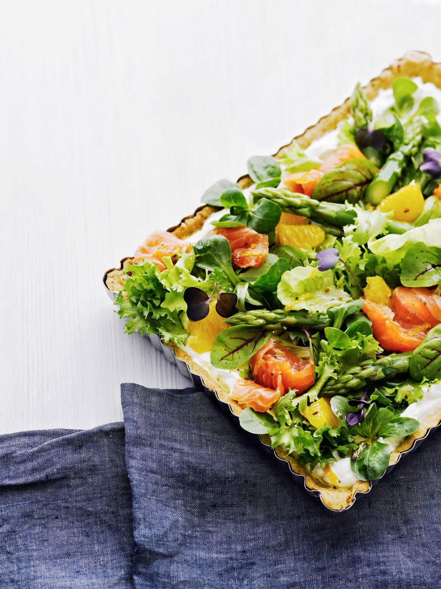 - Levitä piirakkapohjalle jogurtti ja salaatti. Nosta lohet, parsat ja appelsiinipalat päälle. Lisää loput kastikkeesta salaattipiirakalle juuri ennen tarjoilua. Viimeistele mustapippurilla ja suolalla.