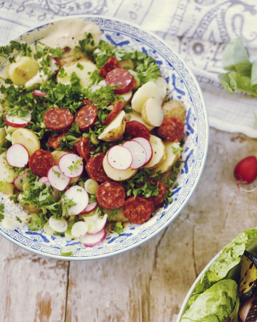 Perunasalaatti yhdistää raikkaasti retiisit, uudet perunat ja tulisen chorizomakkaran.