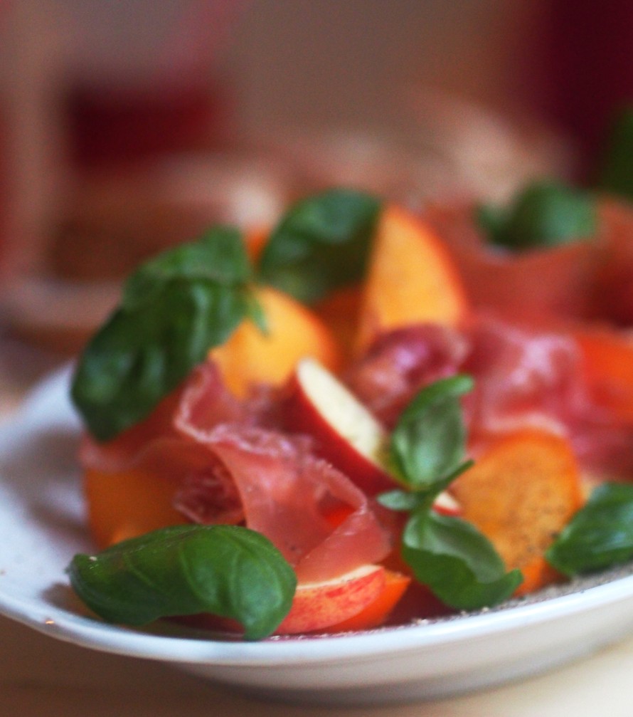 Rullaile kinkkuviipaleet rennosti hedelmien päälle ja koristele basilikan lehdillä.